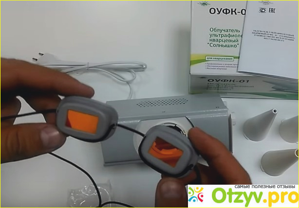 С прибором следует обращаться очень аккуратно. Внутри прибора находится ртутная лампа, поэтому с аппаратом нужно обращаться крайне осторожно, чтобы эта лампа не разбилась. Если аппарат используется для местного облучения, то есть с насадками, да для того же горла, тонужно использовать защитные очки. Тубусы, то есть насадки, вставляются просто. Те, кто в детстве сталкивался с физиотерапией, наверняка разберутся даже без инструкции. Сам прибор фиксируется на подставке с помощью зажимов (барашков) по бокам устройства.