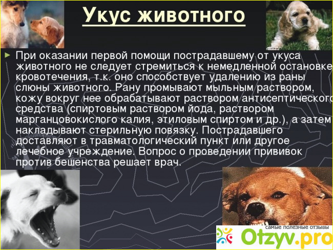Важно постараться получить как можно больше информации о собаке совершившей укус. Если это безнадзорное животное, потребуется исследование на заражение бешенством или столбняком. Укус собаки долго заживает. НА зубах животного очень много бактерий, которые начинают активно развиваться в ране. Важно соблюдать все рекомендации врача, пропить курс антибиотиков и совершать все предписанные лечебные мероприятия.