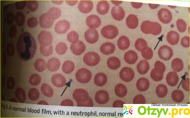 А так вашу кровь видит лаборант под микроскопом. Стрелочкой обозначены тромбоциты, а большой круг с сиреневой сердцевинкой - палочкоядерный нейтрофил.