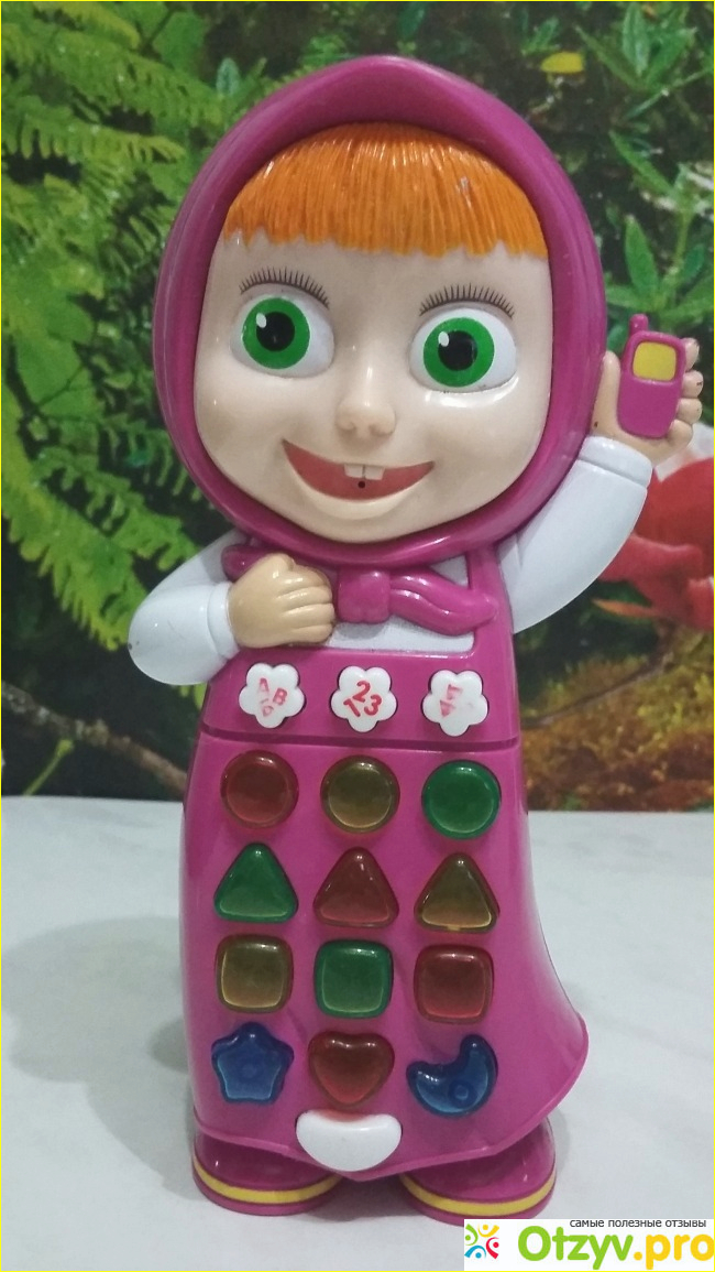 Так же игрушка обучает фигурам и цветам. При одном нажатии Маша произносит название фигуры, при повторном нажатии называет дополнительные характеристики (цвет или колличество углов).