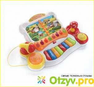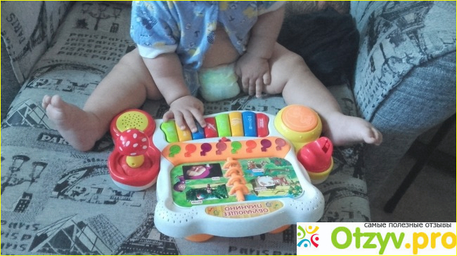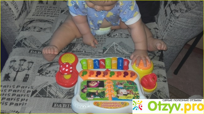 Все кнопки и переключатели подсоединены к узлу управления. При нажатии через встроенный динамик слышен звук. Дети играются, им нравится, но быстро надоедает. Моему племяннику девять месяцев. Он нажимает все подряд. Конечно отрывает тоже все подряд. Самая большая кнопка слева запускает песни из мультфильма. Рекомендовать буду, но больше трех баллов поставить не могу. На мой взгляд подобную вещь можно было реализовать немного попроще.