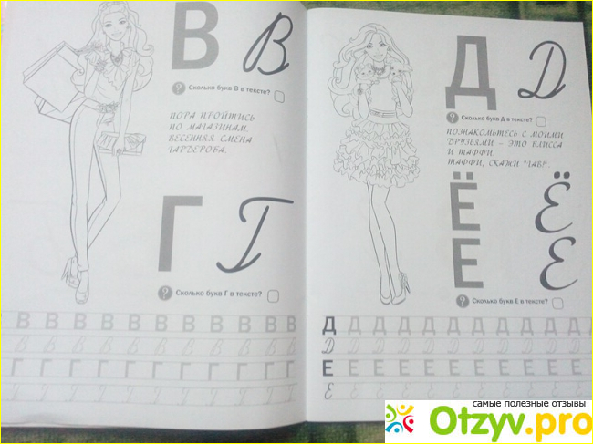 В раскраске с Барби помимо прописей с печатными буквами, есть и прописные буквы.