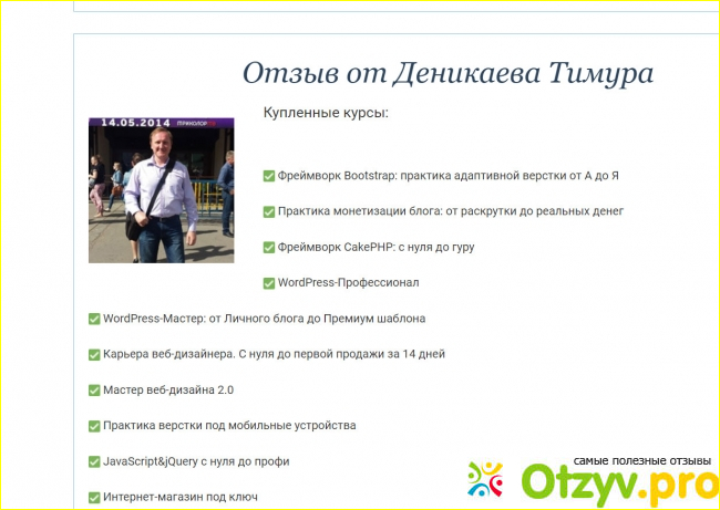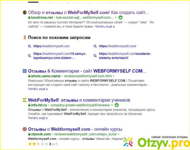 На "Отзовике" стоит средняя оценка 2 из 5 звезд, однако здесь только одна рецензия от автора, репутация которого +1, что ничтожно мало. Молодой человек, если судить по аватарке, считает полученный материал про дизайн веб-сайта плохо поданным. У меня появилась шутка, что владельцам WebForMySelf самим бы пригодились такие курсы, но у нас серьезный обзор.