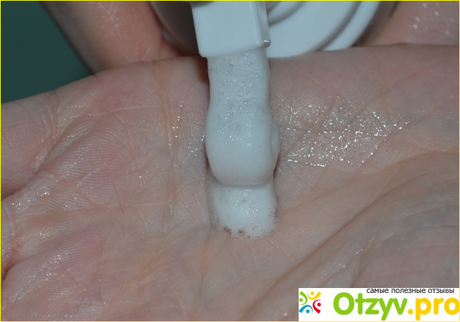 При нажатии получаем из светлой салатовой прозрачной жидкости уже белую пену. Чтобы смыть косметику, мне примерно требуется 2 нажатия.