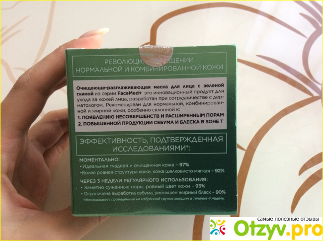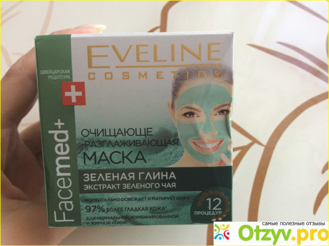 Я вижу видимый эффект от её применения. Моя кожа стала чистой и здоровой. Маску от марки Eveline я смело рекомендую всем девушкам для дополнительного очищения кожи, ее преображения. При этом стоит, что у неё ещё и приятный состав, ведь на в ором месте, после воды, находится зелёная глина в большом количестве.
