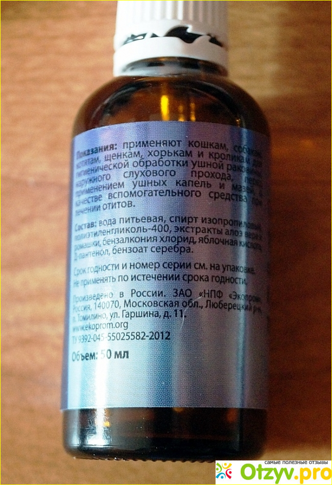 К минусам я бы отнес наличие спирта в его составе. Это меня настораживала в возможности получения определенного ожога ушной раковины домашнего животного, что к нашему счастью не произошло.