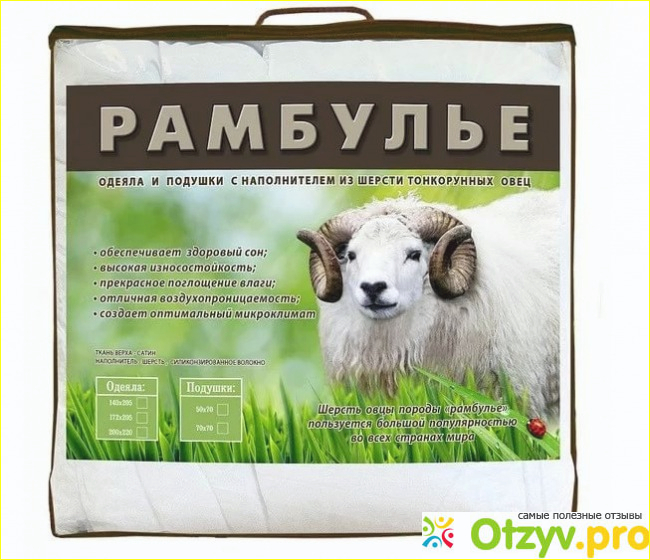 Рамбулье-порода французских овец с тонкой шерстью, то бишь, вышеназванные мериносы. Шерсть их отличается повышенной , ну просто небывалой эластичностью! Ну и как было сказано , несет в себе лечебный, то есть терапевтический эффект, согревает очень. Об этом мне сказал продавец в магазине и еще что-то там поумничал насчет того, что это одеяло воздействует на поры кожи, чего-то там стимулирует и сильно тонизирует. Я поулыбалась, конечно, нифига себе, подумала, что ж это за одеяло такое? Одеяло же для того, чтобы ночью, можно было укрыться от холода. Но возражать не стала, тем более, что знаток своего дела-вышеуказанный продавец, добавил, что этот вид одеял не впитывают влагу . как большинство его братьев, а очень хорошо просушивается, поскольку шерстяные волокна, из которых оно состоит, запросто пропускают воздух и соответственно , очень быстро сохнут. В общем, убедил меня оборотистый купец и я приобрела это одеяло. И ни разу не пожалела, потому-как , кроме того, что продавец мне наговорил(это кстати оказалось истинной правдой, засыпать и просыпаться под таким одеялом, это сплошное удовольствие!) И само по себе оно очень легкое, не то , что его предшественник, который состоял из ваты и во сне слегка придавливал мою, вовсе не атлетическую фигуру. Позже я прикупила еще такие одеяла для своей мамы и сына, кстати, это великолепный подарок . И практично и красиво.