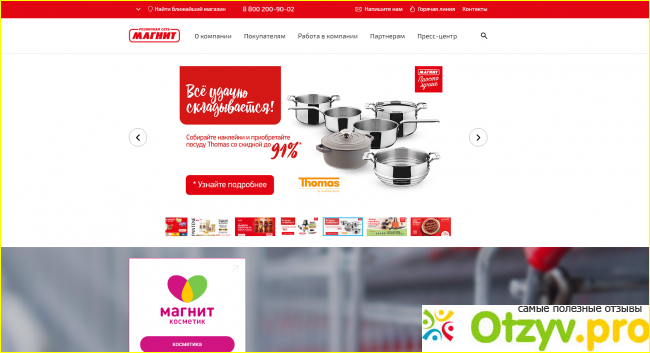 Официальный сайт сети магазинов Магнит оформлен, под стать всем супермаркетам, то есть в рекламной манере. На его начальной странице имеется целый ряд быстро меняющих друг друга изображений. На всех них имеется информация относительно проходящих в данный момент в сети супермаркетов Магнит акций на различные товары (шампуни для волос, кошачьи и собачьи корма, мужскую пену для бритья, растительные масла, форма для выпекания пирогов какой-то крутой фирмы и многое другое). Изображения также можно листать самому вручную, хотя они и без того достаточно быстро сменяют одно другое.