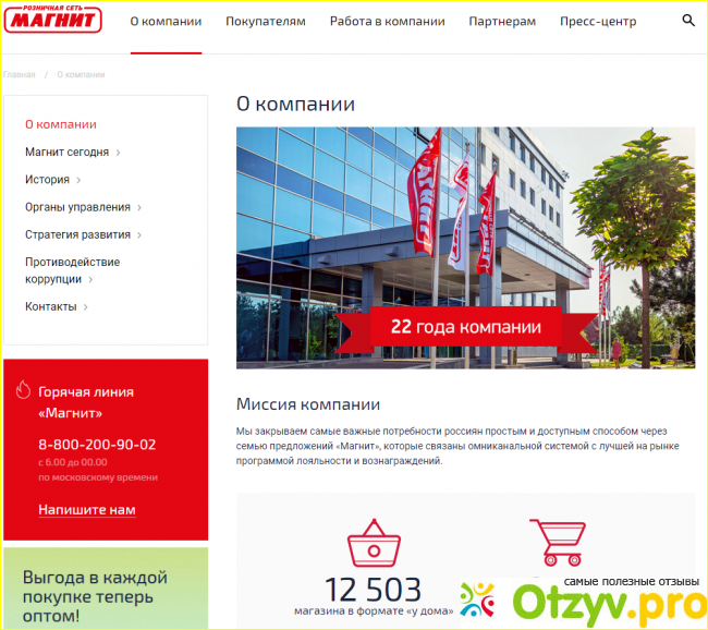 Ниже этого ряда вкладок на официальном сайте Магнит изображена вполне узнаваемая характерная эмблема данного магазина. Справа от нее начинается следующий ряд вкладок. Первая из них несет в себе информацию относительно данной компании. Здесь имеется несколько небольших подразделов, в зависимости от того, кому что интересно в данный момент узнать. Есть здесь кое-что из истории компании, в которой можно узнать, что действует она по России уже чуть более двадцати лет. Есть здесь немного об управляющем штабе данной организации, о стратегии развития фирмы и кое-что еще.