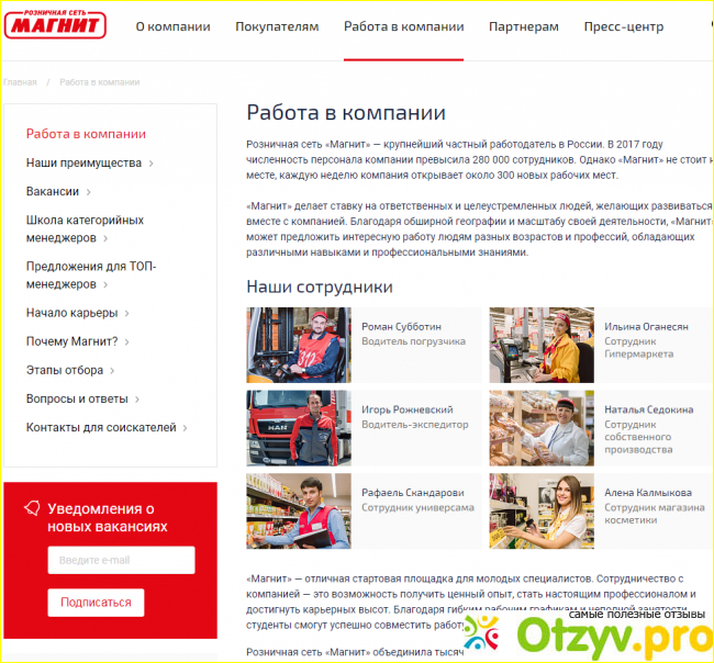 Далее на официальном сайте Магнит идет вкладка, предлагающая трудоустройство в сети магазинов Магнит. Здесь рассказывается о имеющихся на данный момент вакансиях, да и вообще о тех должностях, которые чаще всего бывают востребованы здесь. Подробности своего трудоустройства в магазинах Магнит требуется узнавать в каждом городе индивидуально, так как общих вакантных должностей, разумеется, быть не может, да и заработная плата в каждом регионе за одну и ту же должность может немного отличаться. Ниже в этой же вкладке магазин Магнит рассказывает о том, каков по численности общий штаб рабочих в данной сети магазинов, сколько под их контролем находится фур, перевозящих продукты по различным городам нашей страны. Следом символически в виде значков отмечены все имеющиеся на данный момент награды сети супермаркетов Магнит.