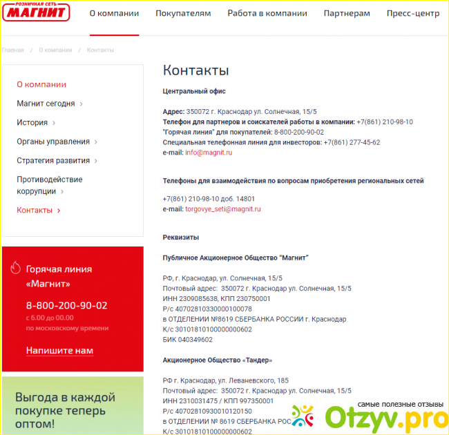 Далее на официальном сайте Магнит идет вкладка, посвященная контактной информации. Здесь написан юридический и фактический адрес главного отделения над всеми магазинами сети Магнит. Также здесь отмечены реквизиты данного отделения, телефон и почтовый ящик для сотрудничающих организаций и тому подобное.