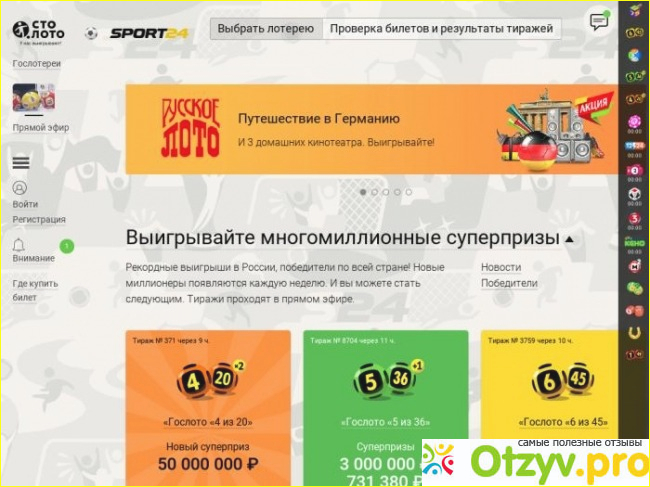 На сайте можно купить билеты самых разных лотерей: Русское лото, Жилищная лотерея, Столото и множество других. Сайт представляет все государственные лотереи.
