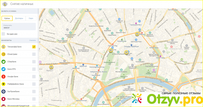 Последней вкладкой из целого ряда на официальном сайте Тинькофф идет раздел, касающийся банкоматов данной организации. Помимо адресов, также можно рассмотреть и их местонахождение на карте, что достаточно удобно и наглядно.