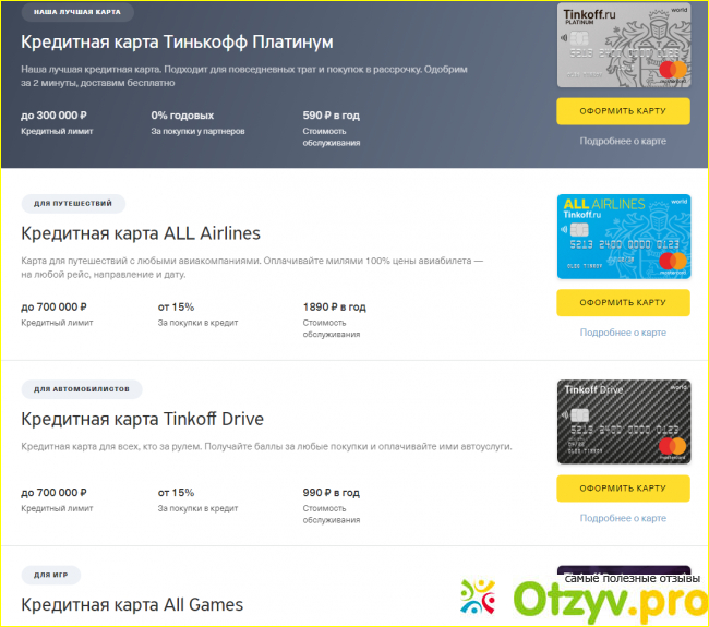 Следующий ряд горизонтальных вкладок на официальном сайте банка Тинькофф также имеет в себе полезную информацию для своих клиентов. Первые две вкладки касаются всех видов пластиковых карт. В основном это, конечно же кредитные и дебетовые карты. Здесь описываются условия получения, какую сумму вам здесь могут одобрить (то есть от скольких и до скольких рублей). Также здесь описана стоимость годового обслуживания данной карты, чтобы это не было ни для кого "сюрпризом". Она здесь довольно не маленькая и составляет почти 600 рублей. На этот момент жалуются многие клиенты данного банка. Видов кредитных карт на официальном сайте Тинькофф предложено очень много (около двадцати разновидностей). Они различаются по своему внешнему виду, но и по кое-каким условиям.