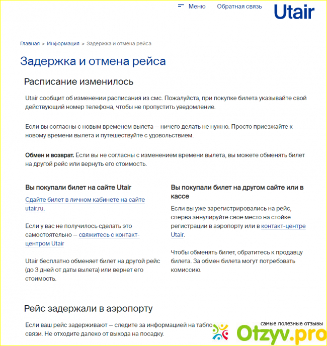 Чтобы клиенты авиакомпании Ютэйр не волновались в случае задержки или же отмены рейса, то на этот случай в разделе информации имеется следующая вкладка. В данном разделе при покупке билетов авиакомпания Ютэйр просит своих пассажиров указывать при покупке свой номер телефона. Тогда в случае задержки или же отмены рейса вам придет уведомление и вы сможете вылететь в другое время или же обменять свой билет, а также вернуть за него деньги.