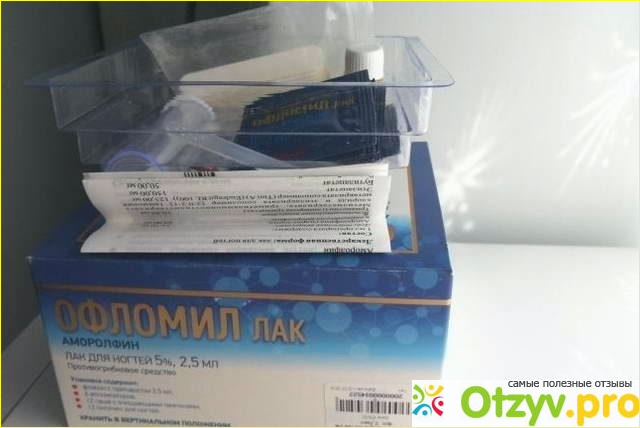 Офломил лак является противогрибковым препаратом, который по словам производителя эффективно излечивает ногти от грибка. В коробочке находится небольшой флакончик с самим противогрибковым средством, одноразовые аппликаторы, спиртовые салфеточки, одноразовые пилочки и подробная инструкция по применению данного противогрибкового препарата.