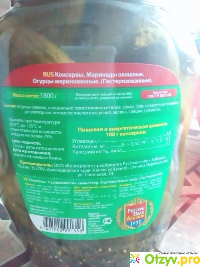 Производитель обещал, что огурцов в банке не менее 50% от массы нетто, водички и приправы оказалось полбанки. Итак, состав: огурцы свежие, специально подготовленная вода, сахар, соль поваренная пищевая, регулятор кислотности: кислота уксусная, зелень, специи, пряности. Масса нетто: 1800 г.