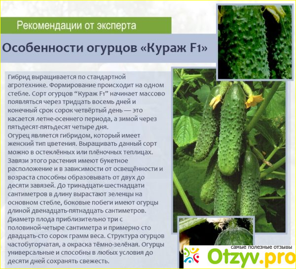 Сорт огурцов Кураж F1 любим и популярен среди многих садоводов и огородников. Благодаря своему хорошему вкусу и простому выращиванию. Особо большого ухода он не требует. Такой сорт прекрасно подходит для консервирования и для еды в свежем виде.