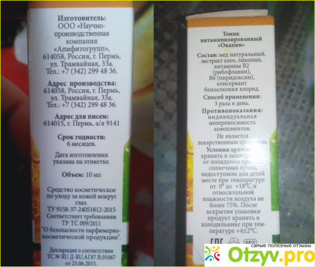На упаковке значится наименование "Окапин. Тоник витаминизированный. Средство косметическое по уходу за кожей вокруг глаз".