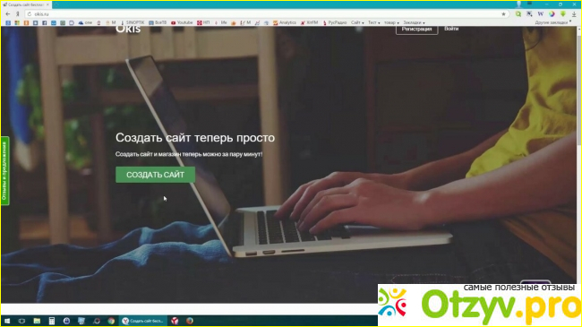 Начнем с приятного дизайна самого веб-сайта. Умеренные неяркие цвета, которые не вызывают агрессию или сильного призыва внимания. Комфортно находится на главной странице, навигация находится на высшем уровне и претензий в этом плане нет. Даже посетитель, который в первый раз посетил Окис, без труда найдет зеленую кнопку "Создать сайт", которая переведет его на нужную страницу.