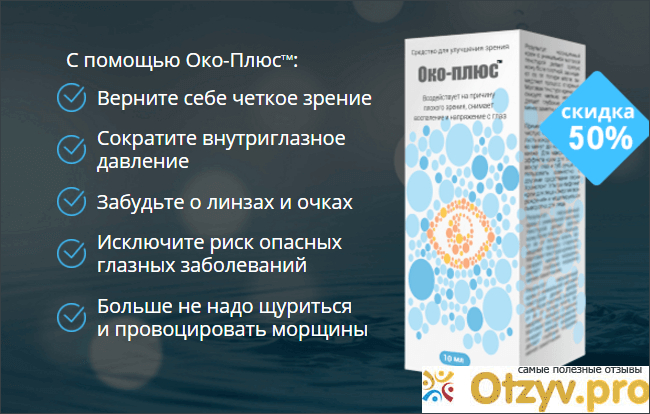 Если у вас появились проблемы с глазами, возникает помутнение, возникает зуд, или же присутствуют различные заболевания глаз, используйте капли Око Плюс, таким образом, вы гарантированно восстановите свои глаза и вернете себе 100% зрение. Так что, безусловно Око Плюс получает наши рекомендации, ведь эффективность этого средства очевидна.