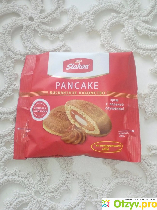 Не так давно блуждала по супермаркету Монетка и нашла прилавок, где лежали всякие вкусные штучки типа вафелек, бисквитов, козинаки и другие лакомства. Решила взять одну интересную и новую для себя штуку к чаю и это был оладушек pancake Slakon с кремом из вареной сгущенки. Продаются они по 1 штуке и цена была всего 9 рублей 90 копеек.