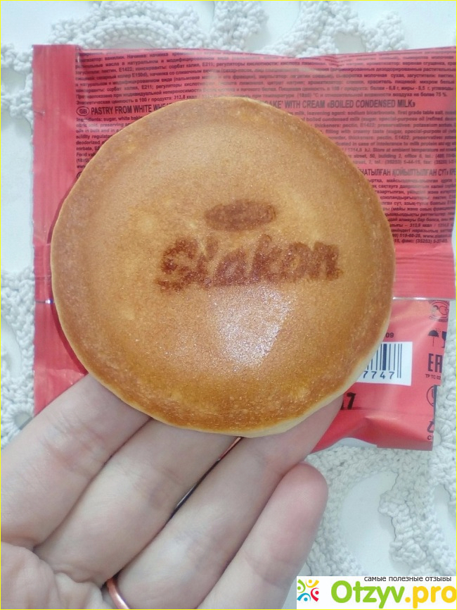 Производитель пишет, что изделие содержит натуральные яйца. Почему-то он решил сделать на этом акцент. Внешне оладушек выглядит симпатично и аппетитно. На его одной стороне даже каким-то образом написан логотип бренда Slakon. Очень круто!