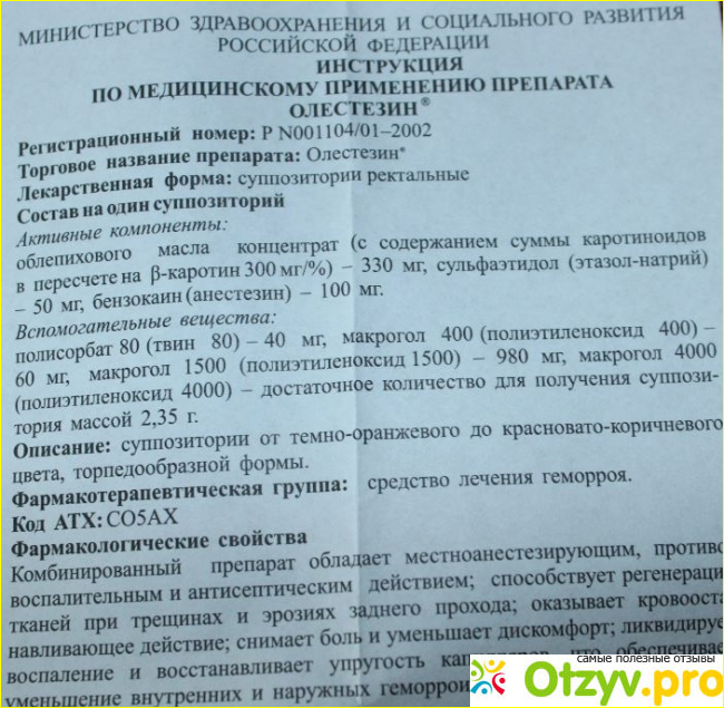 Там мне сообщили, что это анальная трещина, никаких показаний к хирургическому лечению не было, потому было назначено консервативное лечение. Это лечение включало диету, теплые ванночки с ромашкой после дефекации и применение ректальных суппозиториев. Врач озвучил несколько вариантов свечей, которые можно приобрести, но особенно рекомендовал облепиховые свечи. Поэтому в аптеке я приобрела свечи Олестезин. Не буду описывать как проходило мое лечение, скажу лишь, что Олестезин очень мне помог. Во-первых, он избавил от боли и я смогла нормально ходить в туалет, во-вторых через пару дней с начала использования перестали появляться следы крови. Ну и наконец после неделе приема я вообще забыла о своей проблеме. С тех пор никакие симптомы меня больше не беспокоили, поэтому огромное спасибо этому средству!