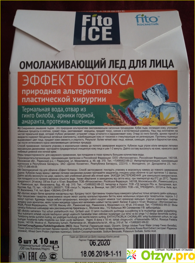 Я теперь постоянный покупатель данного товара, который изготавливается в Московской области. Стоимость льда вполне доступная, 100 рублей. Хватает его на 8 процедур, так как контейнеров 8, по 10 грамм. Конечно, по поводу сравнения с ботоксом не могу сказать ничего, так как не применяла его никогда. Но то, что эффект налицо, утверждаю наверняка. Товар рекомендую.