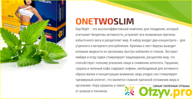 Препарат Onetwoslim - растительное средство, которое содержит концентрат лекарственных растений, способствующих сжиганию жировых клеток.