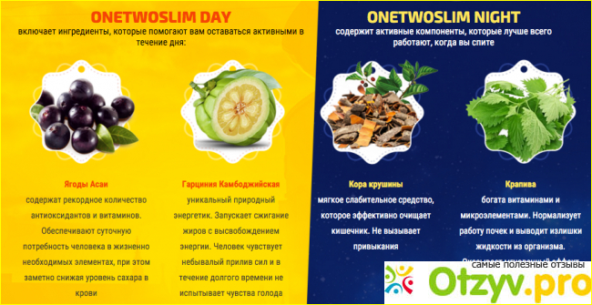Мода на здоровую пищу давно перестала быть «модной», сегодня это естественный фактор нашего существования. Люди внимательно читают этикетки, не едят фаст-фуд и ведут здоровый образ жизни. Производители Onetwoslim, придерживаются тех же параметров и производят натуральную биологическую добавку способную избавить вас от неудобных кило. А так как препарат разбит на фазы дня и ночи, то средство работает с вашим телом круглосуточно. Итак, состав: