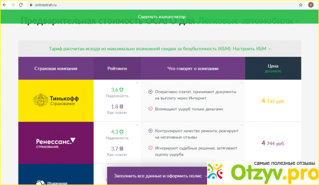Мне как видите выдал большой список страховых компаний, указана цена полиса. есть комментарии по надёжности страховой компании.