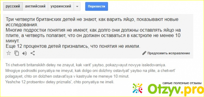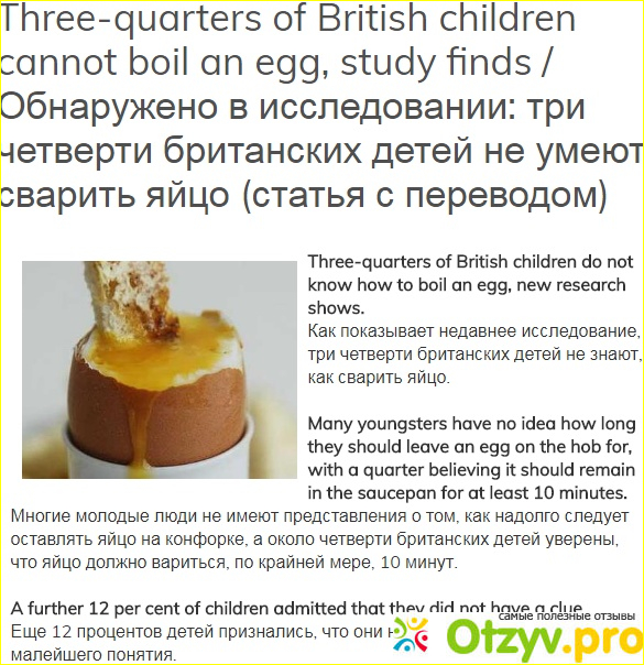 Теперь посмотрим каким будет перевод статьи на английском языке. Возьмем отрывок из статьи об исследовании тему умеют ли британские дети варить яйца. Очень удобно то, что статья дана с синхронным переводом. Поэтому будет легко проверить, насколько хорошо переводит онлайн переводчик.