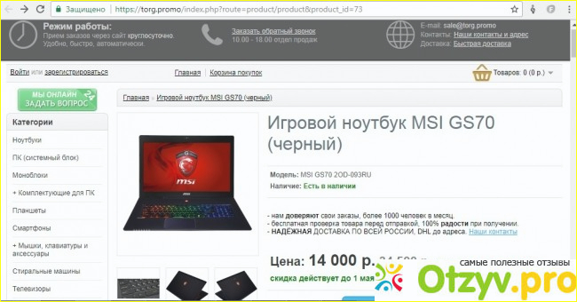 Не переводите деньги! Их электронная почта sale@torg.promo При этом по телефону с ними поговорить нельзя, только в форме переписки по электронке. Всяческими способами намекают, что лучше к ним не приезжать, а оплатить, и всё доставят. Написали, что если я приеду покупать на склад, то к цене будет добавлено 18%. В общем, это кидалы.