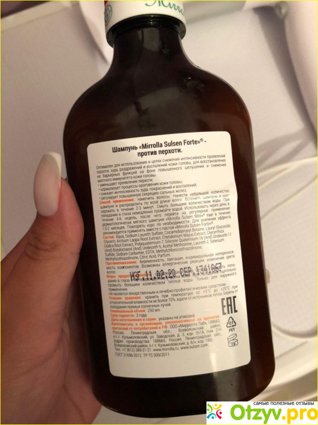 С перхотью, как и с любой другой проблемой лучше бороться, убивать в зародыше. Я оперативно сообразила, что надо специальные средства покупать. Поискала в интернете информацию, основанную на опыте других людей с такой же проблемой. Выделила несколько средств, подумала что проконсультируюсь на месте, что из отобранного лучше взять. Когда пришла в аптеку, посмотрела, что есть в наличии из этих вариантов, двух позиций не было, три были. Посоветовалась с консультантом, посоветовали взять «Mirrolla Sulsen Forte». Его и купила, только еще и пасту такую же взяла, она как маска, но почему-то называется пастой) Упаковку смотрите на фото, ниже прилагаю. Для меня форма выпускай удобная. главное здесь флакон, через который видно содержимое и горлышко, через которое не проливается через край. К упаковке у меня претензий нет, все продумано и удобно. Запах у шампуня травяной, консистенция жидкая, цвет желтый (волосы не окрашивает).