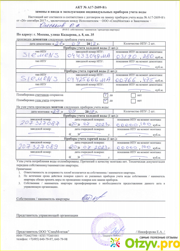 Вроде мелочь, но все же, новый красивый ремонт и такие счетчики – как-то нехорошо. Хотел сначала сам поменять, но времени особо не было этим заниматься, да и тем более гораздо проще специалиста вызвать, у которого есть опыт и все необходимые инструменты, чтобы быстро все сделал и не было никаких проблем. Так и решил. Знакомый мне как раз посоветовал обратиться в фирму ООО Спецмонтаж, он сам у них счетчики менял год назад где-то, сказал что сделали нормально и вполне недорого. Вот и я туда же обратился. Что понравилось сразу – заявку оставил на сайте, и диспетчер девушка сама мне перезвонила уточнить детали. Договорились на определенный день, а счетчики я выбрал фирмы Valtec, с импульсным выходом. Вся работа по деньгам обошлась в 3100 рублей безо всяких доплат. Это стоимость самих приборов, выезда мастера и работ по замене. С учетом того, что мне только оставалось отвезти в еирц документы, какие мастер выдал – сэкономил много нервов, времени и денег в итоге, чем ехать самому покупать счетчики, менять их, потом еще приглашать с УК слесаря, чтобы он их опломбировал и тд…долго это все. Я доволен результатом в общем, не пожалел, что обратился в СпецМонтаж.