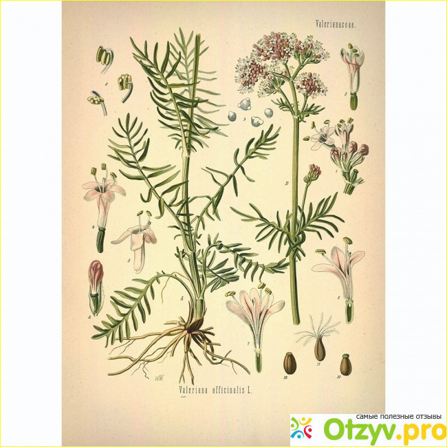 Растение валерьяны — это травянистое многолетнее растение. Однако в нем нас больше всего интересует корень, потому что в медицинских целях принято использовать именно его. Корень валерьяны содержит эфирное масло, борнеол, эфиры борнеола с кислотами (муравьиной, уксусной, масляной), кислоту изовалериановую, алкалоид актинидин, гликозоид валерид, сахара и дубильные вещества.