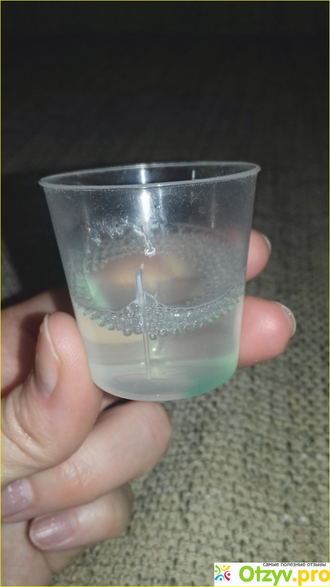 Когда развожу ополаскиватель водой, он немного пенится, и вот какой раствор у меня получается: