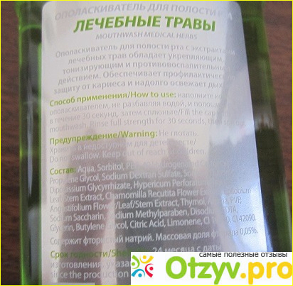 В составе этого средства содержатся такие лечебные травы, как зверобой, аптечная ромашка и иван - чай. Хотя по своему вкусу этот ополаскиватель скорее имеет очень ярко выраженную мятную свежесть.