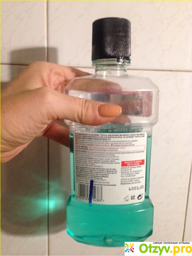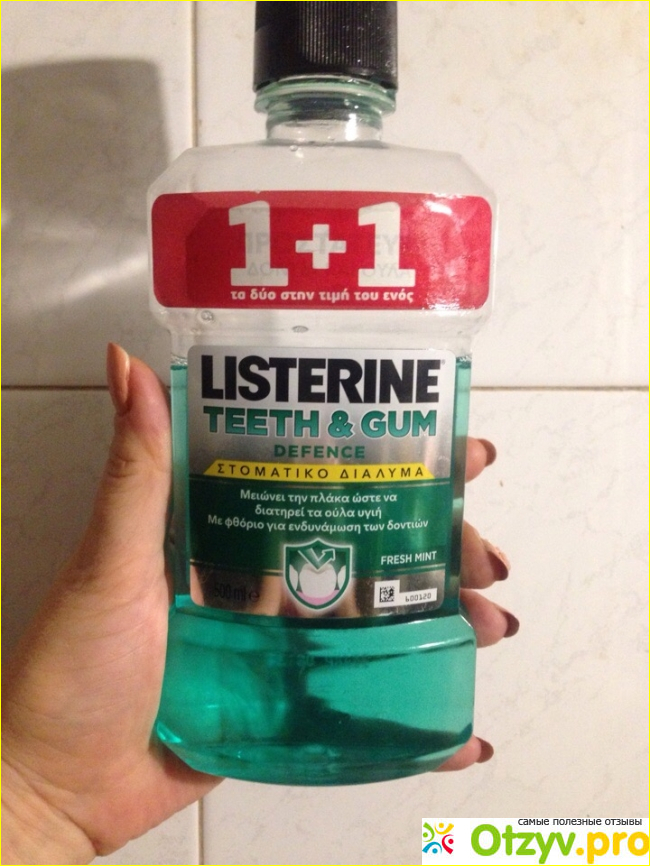 Первый опыт был очень впечатляющим, средство оказалось ядреным и очень едким, у меня аж слезы выступили на глаза. Муж подобрал мне средство помягче, Listerine "Защита десен и зубов".