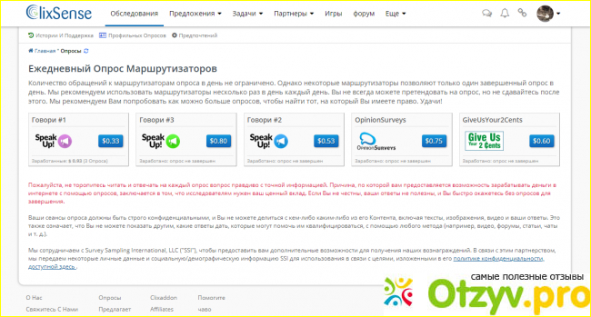 Стоимость заполнения одной анкеты от нескольких десятков центов до нескольких долларов, в зависимости от их продолжительности, (от 10 до 40 минут в среднем). Оповещений нет, чтобы "поймать" анкету, нужно заходить на сайт. Анкет много, но в большинстве случаев россияне не подходят под целевую аудиторию. Можно попробовать заполнить пару десятков анкет, потратив на это минут 40, чтобы убедиться, что Вы не подходите ни к одной из них. За полгода на этом сайте я заработал чуть больше 4$.