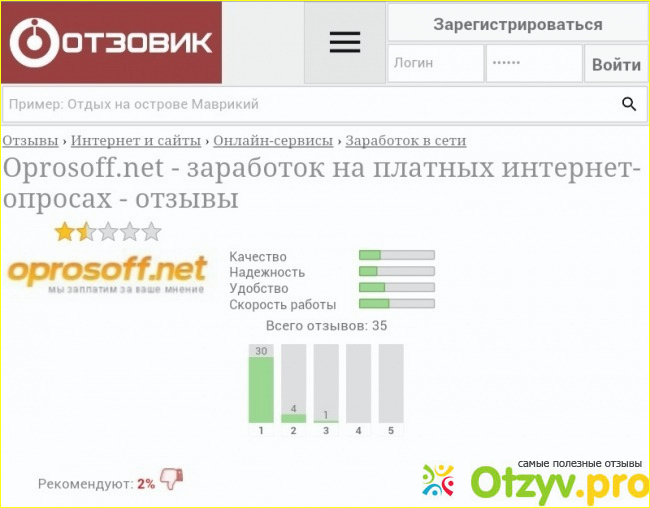 Итак, на отзовике написано 35 отзывов об этом сайте: и ни одной оценки "5", ни одной оценки "4"! Сразу, можете делать выводы, а я продолжу анализ лохотрона. Оценку "3" поставил всего один человек, оценку "4" поставило четыре человека, и оставшиеся тридцать человек поставили оценку "1". Максимальное количество баллов - 5, так что делайте выводы. Все авторы отзывов отзываются о сайте опросов. нет крайне отрицательные. Сейчас сайта в интернете вы, может, и не найдете. Но будете знать, что на подобные вестись не надо. Прежде, чем связываться с опросниками, читайте достоверные отзывы и анализируйте. А лучше вообще подыскать другую подработку на дому.