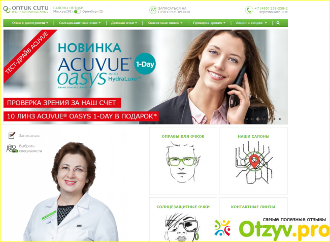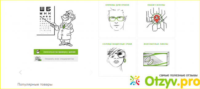На главной странице официального сайта также имеется информация относительно имеющихся оправ для очков, адресов салонов в городе Москве, по поводу солнцезащитных очков и контактных линз. Также здесь можно записаться на проверку зрения. Ниже здесь выложен ряд новинок или же наиболее популярных очков, на половину из которых в данный момент проводятся скидки. Товары, то есть очки, на которые проводятся скидки отмечены специальным красным значком с изображением процентов. Ниже указаны основные услуги, которые предоставляет своим клиентам данная сети магазинов.