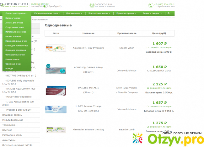 Далее идет раздел, посвященный контактным линзам. У него тоже имеется довольно таки много подпунктов. То есть здесь имеются самые разные линзы и средства по уходу за ними, то есть растворы и специальные капли.