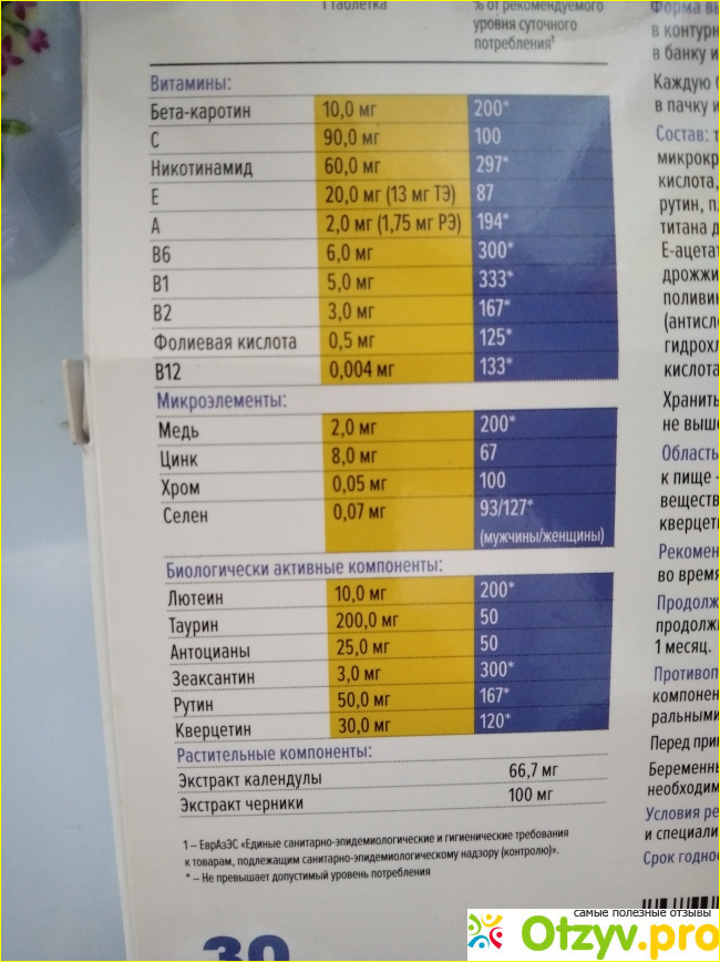 Чтобы усилить эффект еще начала делать упражнения для глаз. Пол пачки уже выпила, как мне кажется, размытость и туманность, будто какая-то пелена на глазах пропала. Насколько поняла, такой прогресс произошел благодаря этому комплексу. И кроме нечеткости оптимаг помог мне от сухости в глазах. То есть у меня было и такое, что утром и днем глаза были совершенно сухие. Даже воды стала больше пить, чтобы это как-то помогло от сухости, но в итоге помог препарат. Уж я не знаю, что именно из состава подействовало, возможно все вместе, но я довольна, что глаза перестали пересушиваться. Кстати еще чуток про состав: в нем есть витамин А и другие витамины поддерживающие зрение, также минералы – медь, цинк, хром, селен. И еще от возрастных изменений, есть вещества-антиоксиданты, чтобы защитить капилляры глаза, хрусталлик и роговицу.