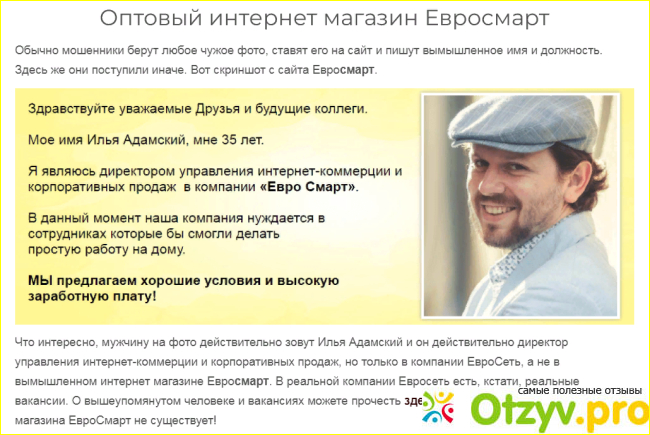 Отзыв на удаленную работу."Евро Смарт" – это крупнейший оптовый интернет-магазин, предлагающий широкий ассортимент товаров и услуг. Сайт компании был создан с учетом потребностей современного потребителя и нацелен на предоставление высококачественного обслуживания”. Именно так звучит призывный лозунг, когда заходишь на их сайт.