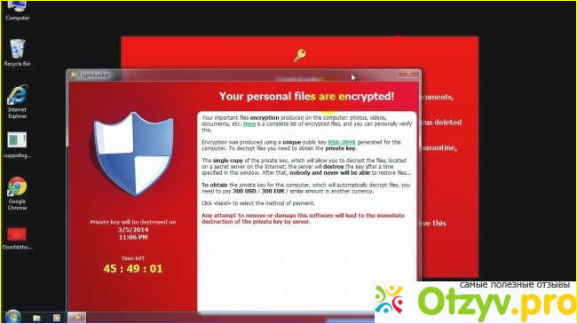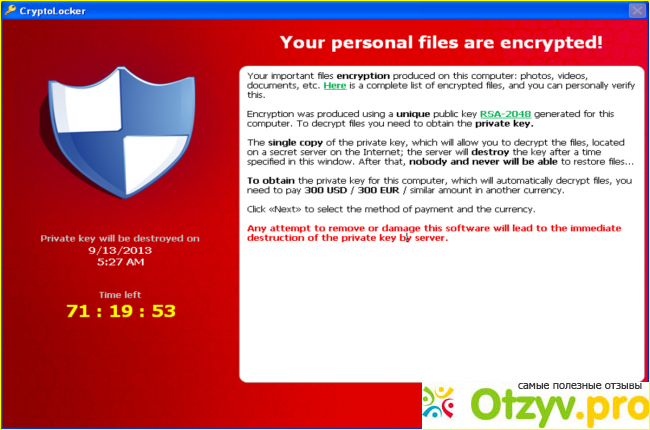 После того, как вирус заражает компьютер, происходит полная блокировка его работы, затем за разблокировку требуется довольно кругленькая сумма. Главным отличием от других вирусов-вымогателей, от которых достаточно легко избавиться, даже в том случае, если происходит серьезное поражение системы, удалить CryptoLocker просто невозможно. Это самый опасный вид «рэнсомвера».