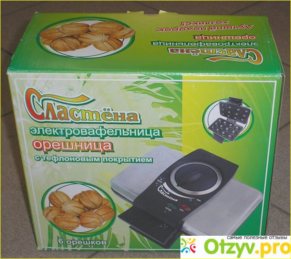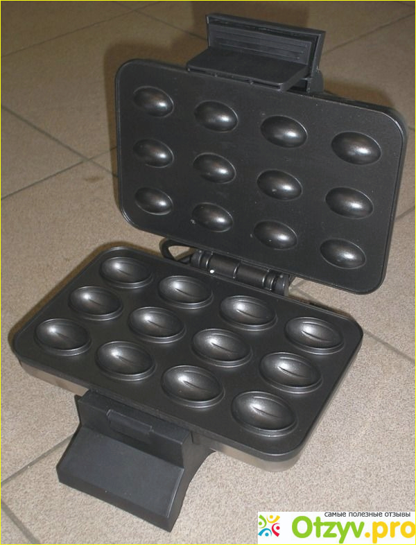 Первое, на что обратила внимание, это керамическое покрытие самого прибора, то есть масло можно не использовать, только немножко при первой закладке. С одной порции получается 12 штук вафельных орешков. Очень интересный внешний вид. Есть два индикатора: нагрев и сеть. Очень удобный регулятор температуры, к стати вращается не сильно туго, если одна рука испачкана тестом, то второй можно спокойно повернуть рычаг. Что касается шнура, то он немножко маловат, хотелось бы по - длиннее, чтобы удобно было размещать возле розеток, но в принципе есть переноски- поэтому это не такая уже и проблема. Устойчивость самой орешницы тоже немножко подкачала, нужно было производителям обратить на это внимание. Но в процессе жарки, на этот нюанс особо не обращаешь внимание. Когда только получили товар, еще обратила внимание, что верхняя и нижняя крышки не плотно ложатся друг на друга, есть не большой люфт. Но когда закладываешь в орешницу тесто, он в обще не ощутим.