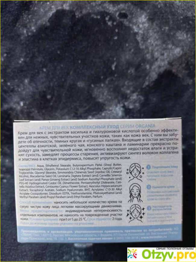 Увидела на озоне неплохую рекомендацию по серии Organia, производитель всем знакомый, Твинс Тэк, те кто выпускают 911. Линейка достаточно большая, есть из чего выбрать. Я взяла крем для век с комплексным уходом. Перед нанесением обязательно умывалась и избавлялась от косметики. Наносила крем тонким слоем, сильно не втирала, больше массажными движениями. Первое что мне понравилось, состав и его аромат, очень приятный, нежный.