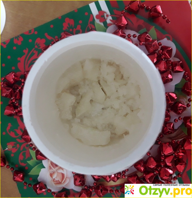Когда я забрала посылку и достала из нее это масло, то услышала, что в пластиковой банке плещется жидкая субстанция. После того, как масло постояло в холодильнике, оно превратилось в твердую массу белого цвета, кусочки от которой можно легко откалывать ножом.
